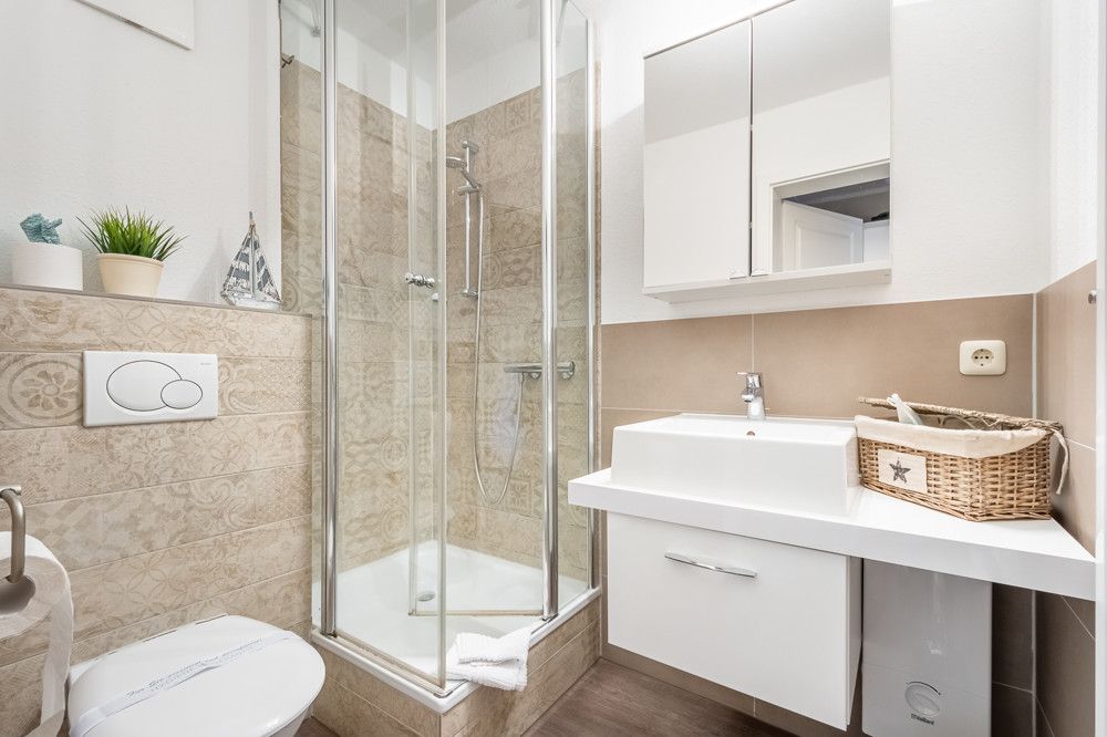 Geschmackvoll komplett neu eingerichtetes Appartement, nur wenige Meter vom Ostseestrand, der Meerwasserschwimmhalle und von der Kurpromenade und vom Kurpark entfernt. Die Wohnung befindet sich im Erdgeschoss der überschaubaren Anlage "Bellevue" und verfügt über einen eigenen Eingang. Vom großzügigen Flur gelangen Sie in den geschmackvoll eingerichteten, kombinierten Wohn- Essbereich. In dem hellen und freundlichen Wohnzimmer mit der offenen Wohnküche, ist wie die gesamte Wohnung Vinylboden verlegt worden. Im Küchenbereich befindet sich eine separate Essecke, die zum gemeinsamen Essen und Spieleabenden in guter Gesellschaft einlädt. Das Schlafzimmer ist nicht sehr groß. Das Doppelbett reicht von Wand zu Wand und hat eine Breite von 1,80 x 2,00 m. Das Duschbad ist hell, freundlich und frisch gestaltet. Strand, Schwimmhalle, Hafen, Marine-Ehrenmal, U-Boot und das Ortszentrum sind nach wenigen Minuten Fußweg zu erreichen.