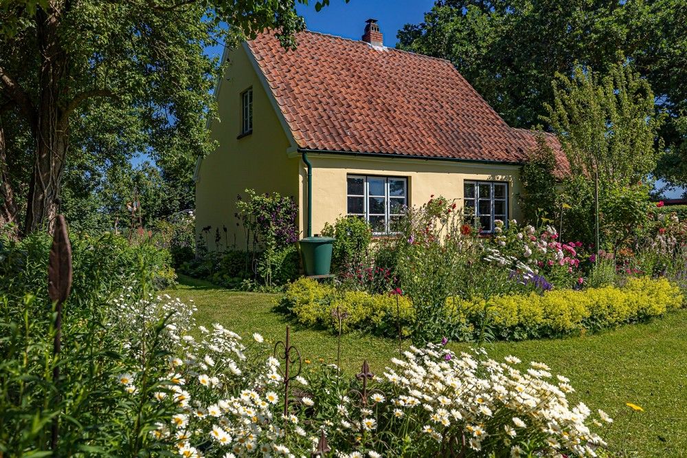 Schlafzimmer im Obergeschoss sowie ein kleines Badezimmer mit Dusche. Die Küche passt perfekt zu dem Stil des Hauses und bietet Platz für eine Essecke. Die helle und freundliche Raumaufteilung schafft eine warme und einladende Atmosphäre, die durch den wunderschönen Garten mit Gartenhaus perfekt ergänzt wird.