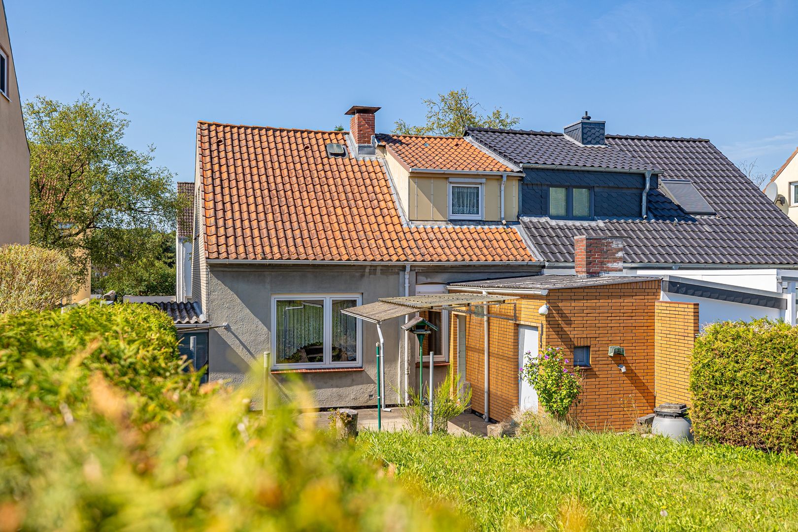 Von der Küche gelangen Sie in den seitlichen Anbau und von dort auf die große Terrasse in Nord-Ost-Lage und in den Garten, der pflegeleicht angelegt ist. Eine Garage mit einem Stellplatz davor rundet dieses Immobilienangebot ab.