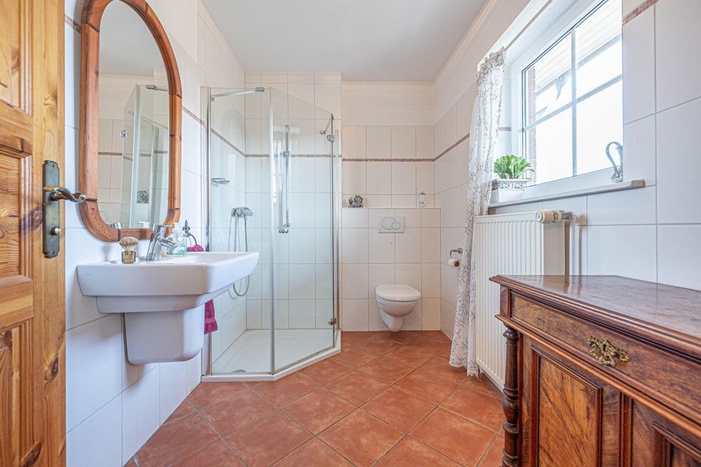 Die beiden, zeitlos gestalteten Badezimmer sorgen für zusätzlichen Komfort und tragen zum Wohngefühl bei. Aus dem Vollbad im Dachgeschoss mit Badewanne und Dusche können Sie einen herrlichen Weitblick bis zur Ostsee genießen.
