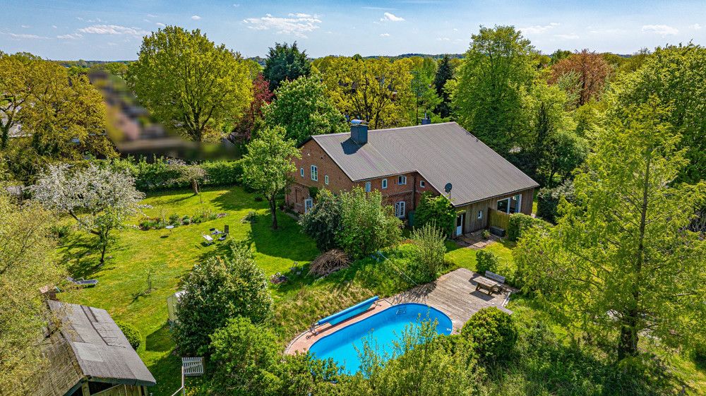 Dieses Anwesen mit einer Größe von ca. 9.030 m² befindet sich in einem hervorragenden Pflegezustand. Das Wohnhaus wurde in den vergangenen Jahren liebevoll restauriert und der alte Charme weitestgehend erhalten. Hohe Decken, offene Balkenlage, dänische Holzfenster, Dielenfußböden und viele weitere Elemente sorgen für rustikale Gemütlichkeit. Die Wohnfläche beträgt etwa 225 m² und die insgesamt 5 Zimmer verteilen sich auf 2 Ebenen und bieten ausreichend Platz für eine große Familie. Wem der Platz noch nicht ausreicht, der freut sich über die Ausbaureserve im Obergeschoss (ca. 148 m²), wo Sie neben einem Duschbad auch ein großes Schlafzimmer vorfinden. Im Erdgeschoss stehen Ihnen 3 Zimmer, eine gemütliche Küche mit Küchenhexe und Zugang in den Garten, sowie ein Vollbad zur Verfügung. Im großzügigen Wohnbereich sorgt ein Kaminofen nicht nur im Winter für wohlige Wärme. Hier kann man es aushalten... Vom Wohnzimmer aus gelangen Sie trockenen Fußes in den Wellness-Bereich, wo eine gemütliche Sauna und eine große Doppeldusche für Sie bereitstehen. Hier gibt es ebenfalls einen direkten Zugang zum wundervoll eingewachsenen Garten mit altem Baumbestand, der unter anderem auch einen herrlichen Swimming-Pool beherbergt... Die Terrasse am Pool ist uneinsehbar, sodass Sie in Ruhe ein paar Bahnen schwimmen können. Hier kann man die Seele baumeln lassen...