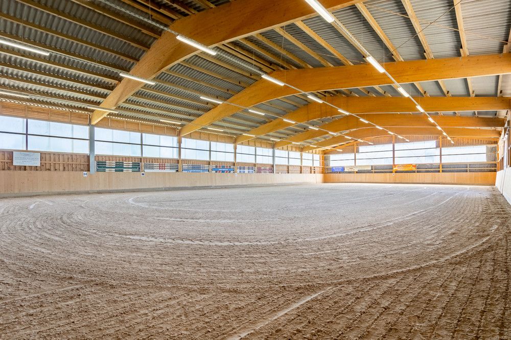 Die Betreiberwohnung verfügt über insgesamt 5 Zimmer, die sich auf zwei Ebenen verteilen. Sie verläuft über die gesamte Breite der Reithalle. Vom Obergeschoss aus genießt man einen fantastischen Blick hinunter in die Halle - Das ist besser als jeder Fernsehabend. Neben einer großen Wohnküche finden Sie hier ein modernes Badezimmer und 3 weitere Räume vor, während sich im Erdgeschoss noch ein zusätzliches Zimmer und der Zugang zu den Ferienwohnungen und auf die Terrasse befindet.